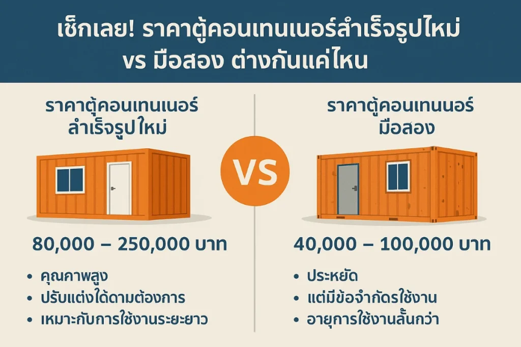 การเลือกซื้อ ตู้คอนเทนเนอร์สำเร็จรูป เป็นทางเลือกยอดนิยมในยุคปัจจุบัน ไม่ว่าจะใช้เป็นสำนักงานชั่วคราว ป้อมยาม หรือห้องน้ำในไซต์งาน หลายคนมักสงสัยว่า “ควรเลือกตู้ใหม่หรือมือสอง” และ “ราคาต่างกันคุ้มค่าหรือไม่?”